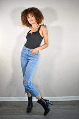Hold me tight” Sophie Jean is a slime fit, High waist comfortable denim with light stretch, are distressed style Jean pairs well with our Ella top add accessories to elevate the look and I will be perfect for a day out, lunch date.